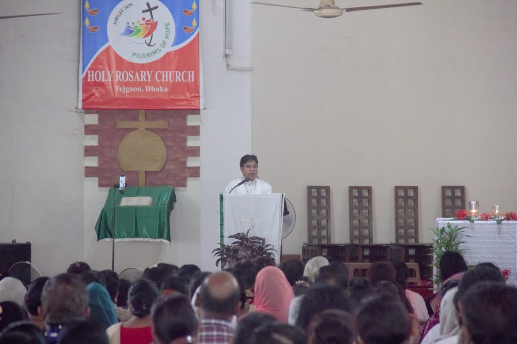 গত ১১ জুলাই, শুক্রবার, ২০২৫ খ্রিষ্টাব্দ তেজগাঁও ধর্মপল্লীতে ঢাকা মহানগরের ১০টি ধর্মপল্লী একত্রিতভাবে উৎসবময়তার মধ্য দিয়ে পালিত হলো পরিবারে মিলন, শান্তি ও ভালবাসার জুবিলী উৎসব। সার্বিক ব্যবস্থাপনায় ছিল ঢাকা মহনগর আঞ্চলিক পালকীয় পরিষদ এবং ঢাকা মহাধর্মপ্রদেশ পরিবার কল্যাণ পরিষদ। এই জুবিলী শিক্ষা সন্মেলনের মূলভাব ছিল- পরিবর্তিত বিশ্বে আশাময় সমাজ বিনির্মাণে মানব পরিবার। এতে ঢাকা শহরের বিভিন্ন ধর্মপল্লী থেকে ফাদার, ব্রাদার, সিস্টারগণ সহ ৭০০ খ্রিষ্টভক্ত অংশগ্রহণ করেন। অনুষ্ঠানের শুরুতেই তেজগাঁও গির্জার বাইরে মহামান্য কার্ডিনাল এক গুচ্ছ বেলুন উড়িয়ে জুবিলী সন্মেলনের শুভ উদ্বোধন করেন। বেলুন উড়ানোর পরপরই নৃত্যের মেয়েরা নৃত্য পরিবেশন করে এবং নৃত্যের পর শোভাযাত্রা করে গির্জা ঘরে প্রবেশ করা হয়। অর্থপূর্ণ প্রার্থনা অনুষ্ঠানের মধ্য দিয়ে মূল পর্ব শুরু হয়। পরে শুভেচ্ছা বক্তব্য রাখেন স্থানীয় পাল পুরোহিত ফাদার জয়ন্ত এস গমেজ, ঢাকা মহানগর পালকীয় পরিষদের চেয়ারম্যান ফাদার আলবাট রোজারিও, পরিবার কল্যাণ পরিষদের চেয়ারম্যান ফাদার তুষার গমেজ এবং পরিবারের পক্ষে হাউজিং সোসাইটির চেয়ারম্যান প্রতাপ আগষ্টিন গমেজ। তারা বলেন, আমাদের পরিবারগুলোকে আরো পবিত্র, স্বাস্থ্যপ্রদ, সুখী, গতিশীল ও আনন্দদায়ক রূপে গড়ে তুলতে হবে। শুভেচ্ছা বক্তব্যের পরই মূল বিষয়ের উপর মূল্যবান বক্তব্য রাখেন ফাদার মিন্টু লরেন্স পালমা। তিনি বলেন, ঈশ্বর আদম-হবার মধ্য দিয়ে আমাদের পরিবাগুলোর জন্য একটা ঐশ পরিকল্পনা করেছেন। কিন্ত পরিবর্তিত বিশ্বে আমাদের পরিবারগুলো সেই পরিকল্পনা থেকে বের হয়ে এসেছে। তিনি উপস্থিত সবাইকে আহ্বান করেন আমাদের পরিবারগুলো যেন সেই পরিকল্পনা মধ্যেই থাকে। এরপর চা বিরতি দিয়ে পবিত্র সাক্রামেন্তের আরাধনা ও ব্যক্তিগত পাপস্বীকার হয় এবং শেষে পবিত্র খ্রিষ্টযাগ উৎসর্গ করেন মহামান্য কার্ডিনাল প্যাট্রিক ডি রোজারিও, সিএসসি। খ্রিষ্টযাগের উপদেশে তিনি পরিবারে উপর সুন্দর উপদেশ বাণী রাখেন। তিনি বলেন, মহান জুবিলী বর্ষে পরিবারকে নিয়ে এই জুবিলী করা হচ্ছে। আজকে আপনারা যারা এখানে এসেছেন তারা অনেক অনেক ঈশ্বরের অনুগ্রহ লাভ করবেন। আপনারা আপনাদের পারিবারিক জীবন সুন্দর রাখার চেষ্টা করে যাচ্ছেন। আমাদের জন্য আশার বিষয় প্রভু যিশু আমাদের সমস্ত পরিবারের জন্য প্রার্থনা করেন। পরিবারে তোমরা যেন এক হতে পার। কারণ এতেই পরিবারের গৌরব ও কল্যাণ। শেষে দুপুরের আহারের মধ্য দিয়ে অর্ধ দিবসব্যাপী অনুষ্ঠানের সমাপ্তি হয়।